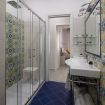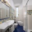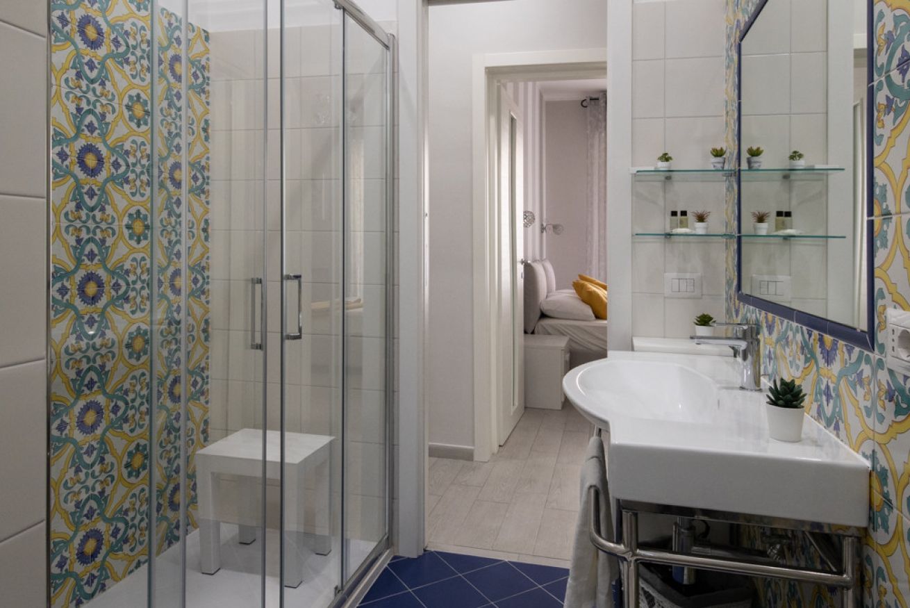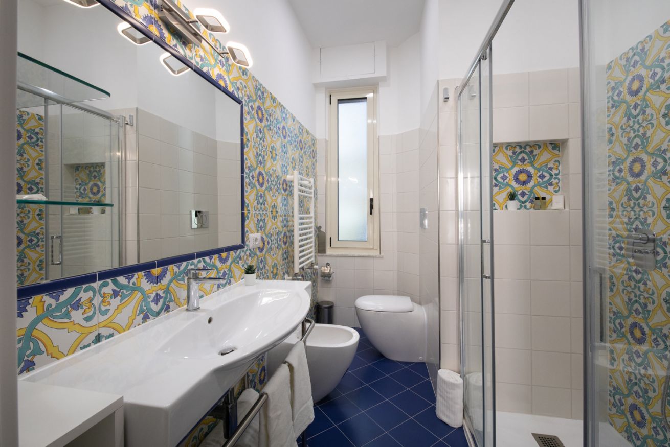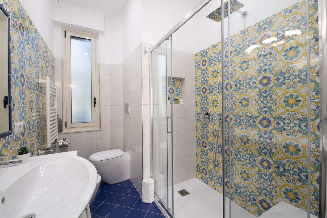 The bathroom, a true jewel of the house, is equipped with a spacious shower decorated with splendid traditional majolica tiles from the Coast, which recall the colors of the sea and the sun. The ceramics, made with artisanal motifs, make the environment lively and typically Mediterranean, transforming even the moment of relaxation into a sensory experience.