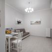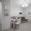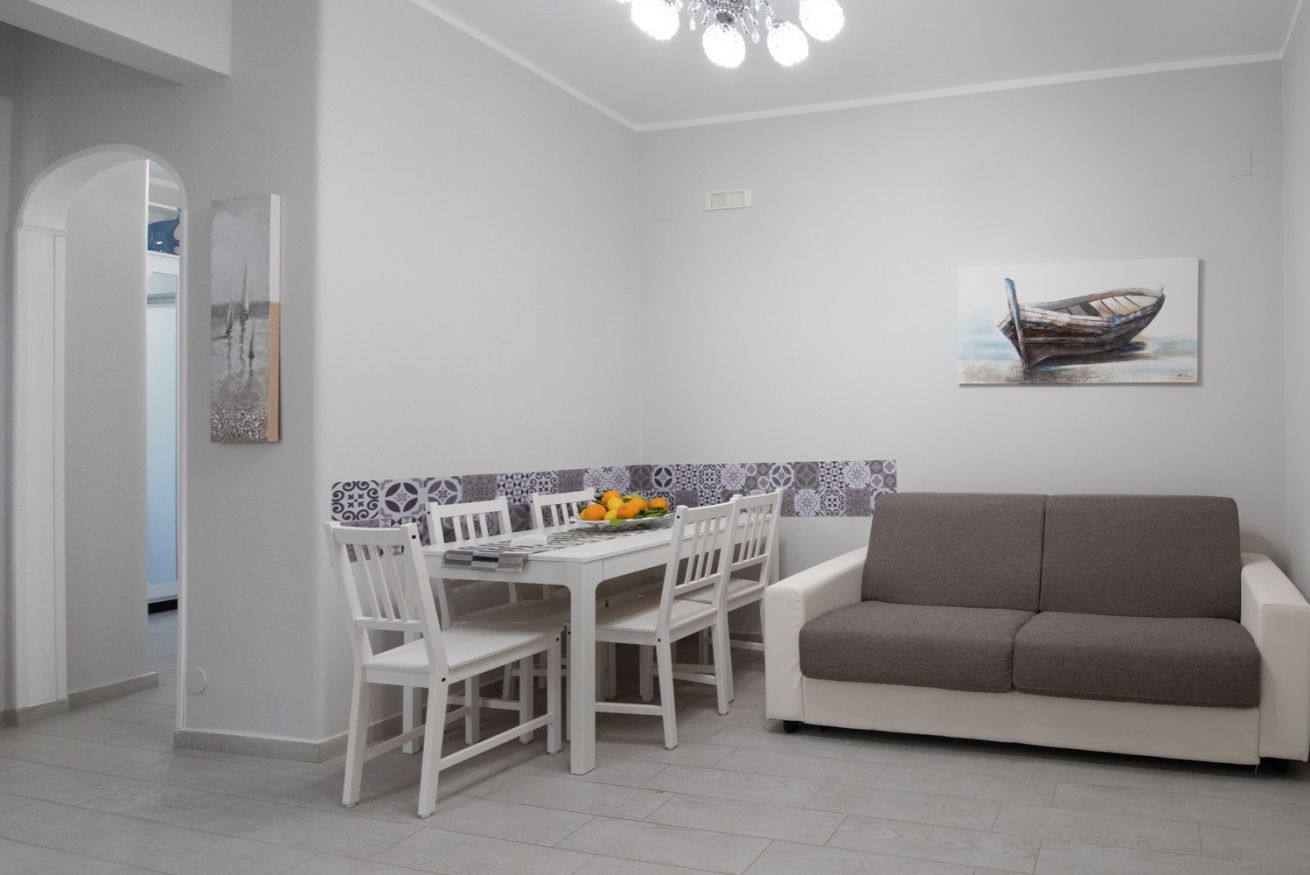 The interiors are decorated with light tones and sunny details that create a relaxing atmosphere, perfect for regenerating after a day discovering the coast. The living room is furnished with a comfortable sofa and a dining area where you can enjoy a simple dinner or share a moment of relaxation. The kitchen, separate and fully equipped, allows you to experience the house as a real place, with all the comforts you need.