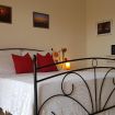 The private outdoor terrace, furnished with a coffee table and armchairs, offers a relaxing space where you can have breakfast, read or enjoy a quiet moment after returning from excursions. Inside, the living room is large and bright, with a sofa, dining table with chairs and a desktop computer available to guests, useful both for working and for organizing the days.